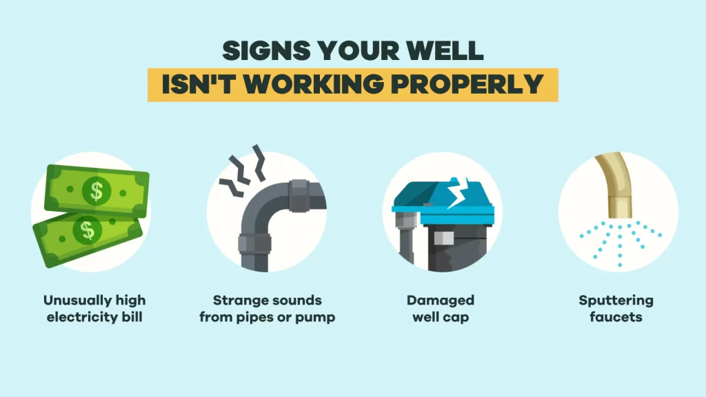 Image Text: Infographic showing warning signs of private well pump failure, including rising electric bills, short cycling, low water pressure, and system overload, with guidance on proactive well system evaluation to prevent breakdowns.